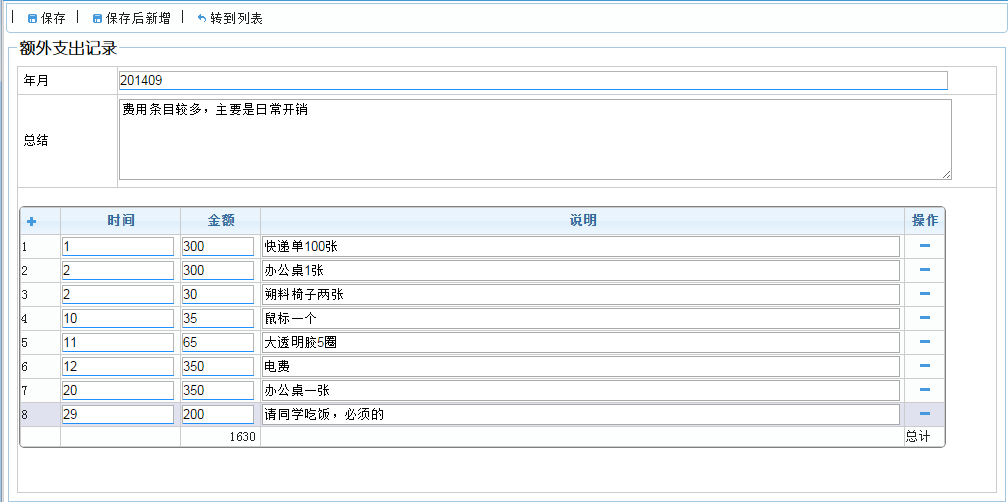 有了自定义业务表单,以前将Excel通过邮件发来发去修改的方法,可以彻底放弃了。下面是一个非常简易的零散消费记帐表,就是这么简易(自带权限控制,使一些人只读,一些人可改内容):