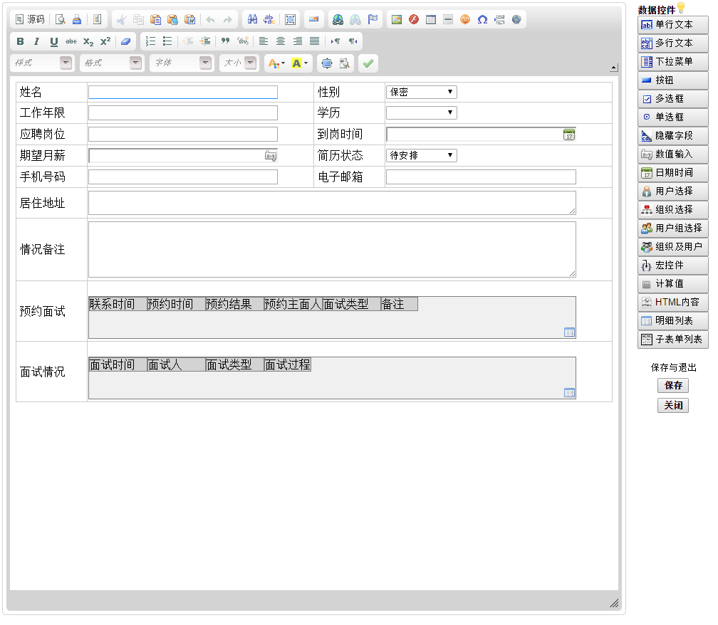 业务表单的设计器,以直观的图形化展现,简单易用。通过右边的数据控件,可直接布局界面元素;通过顶部的工具栏,可对控件元素作各种设置: