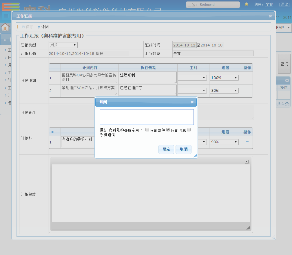 工作计划、工作汇报设置了“汇报对象”,则相关人员可评阅该工作计划、工作汇报: