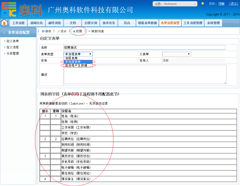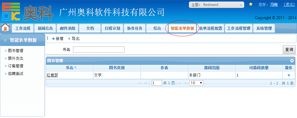 奥科OA协同办公平台除了能配置流程表单外,还可以将自定义设计的表单,用于非流程的数据管理工作: