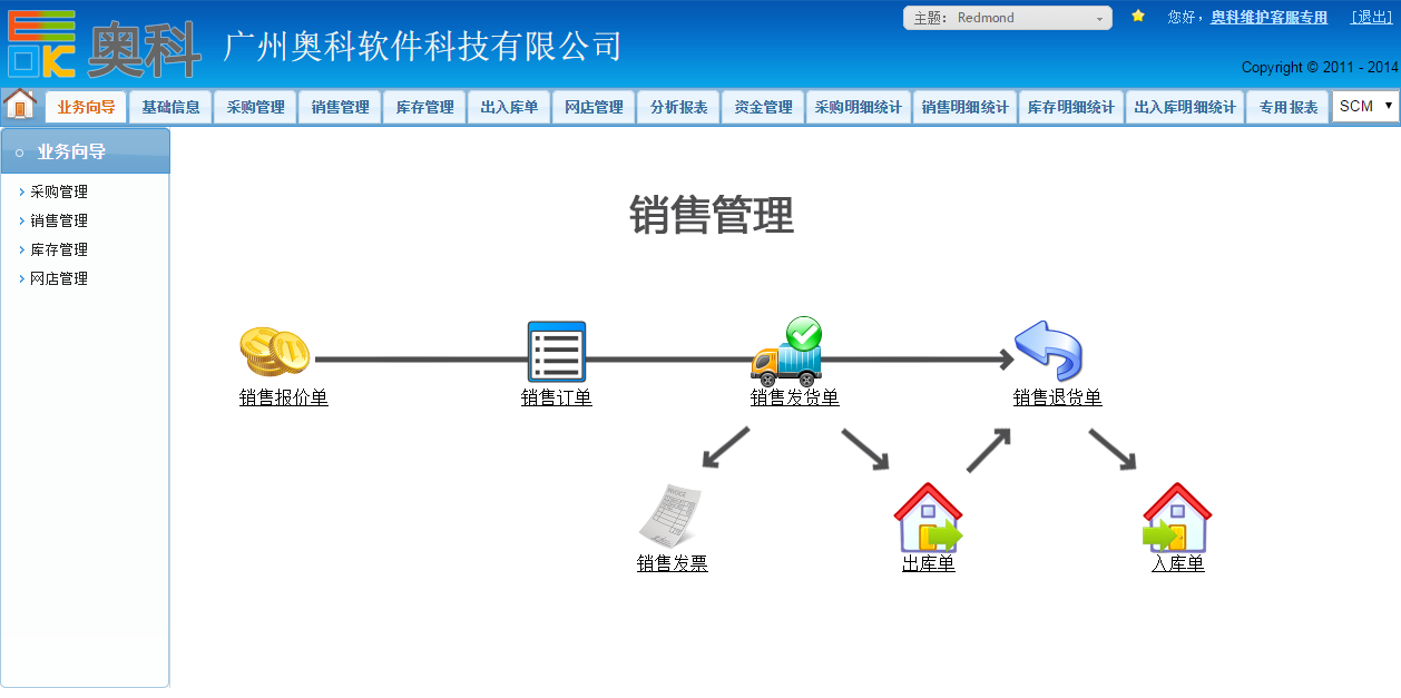 奥科供应链的销售管理主要包含了“销售报价”、“销售订单”、“销售发货”、“销售出库”、“销售退货”、“销售发票”等功能:
