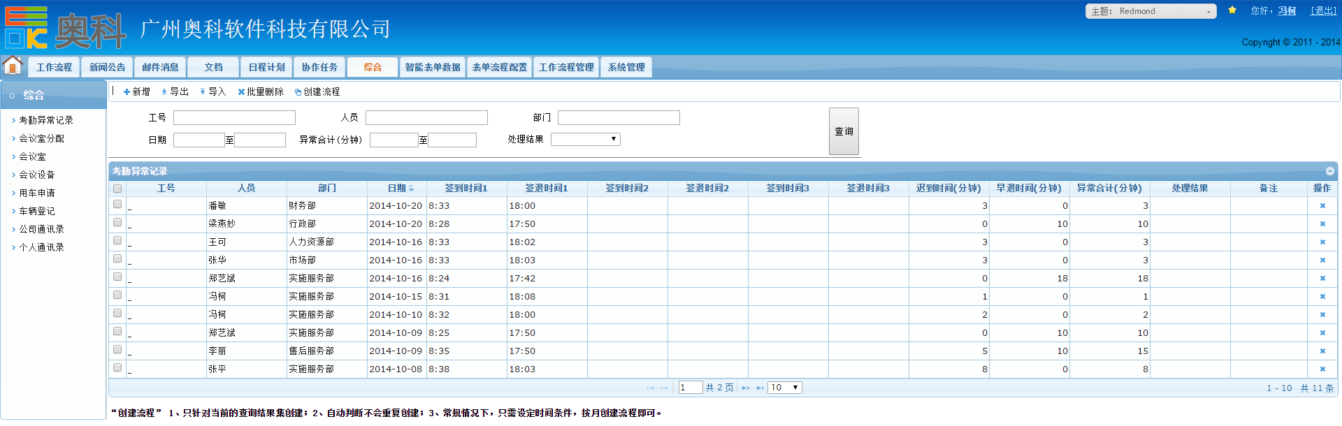 究竟能做些什么奥科OA协同办公平台面向全国企业提供在线使用服务。究竟奥科OA协同办公平台能为这些企业做些什么呢?首先,我们可以肯定的:考勤异常处理、网上报销、日程计划汇报、邮件消息、名片印刷申请、请假申请、出差申请、加班登记、会议安排、用车申请、工作交办、外出登记、借支申请、请款付款申请、发票申请等日常工作,都可以由奥科OA协同办公平台来协同完成。其次,奥科OA协同办公平台还提供强大的 自定义智能表单功能 ,可以满足企业更深入更高级的数据在线信息化的要求。 对于部分中小企业来说,有些流程是根本不需要走信息化系统来完成的。但是,总是有些流程,老板希望通过信息化系统来协同提高工作效率。比如:企业只要有考勤制度(比如指纹、打卡考勤),那总需要 考勤异常处理 吧;企业只要有月度、季度费用报销,那 网上报销 可以派上用场吧;企业只要有须安排和管理的工作任务,可共享可评阅的 日程计划汇报 应该是个不错的选择吧;其他的诸如邮件消息、名片印刷、请假申请、出差申请等等,也都是企业的常见功能以及常用流程,企业也可按需使用。 个别中小企业的老板,可能只希望那么两三条流程通过信息化系统来规范管理完成,但要花钱购买OA系统,又划不来,所以为难了。况且花了钱,买回来还不一定好用,所以更为难了。奥科OA协同办公平台为企业提供在线使用服务,专业的功能模块,让企业 低成本、零部署、零维护 直接在线使用OA系统,真正做到 低投入而大产出 协助企业成长。 考勤异常处理考勤异常处理作为最常用的企业流程处理之一,其流程大致如下: 一、从考勤机中导出考勤异常数据,按格式导入本系统中(本系统的导入格式基本与大部分考勤机的异常导出格式一致,如需具体考勤机型号,可联系奥科软件)。 二、一键发起异常处理流程。流程直接读取异常数据,并将领导审批的每条处理结果直接回写到异常数据,无需传统的人工邮件通知、领导邮件审批、最后人工合并处理结果。 简单两步操作,10天后(假如行政上规定10天内处理好考勤异常),导出需要惩罚(比如缺勤扣工资)的处理结果,交人力部门或者财务部门处理。 导入导出界面: ![]() 流程界面: ![]() 网上报销网上报销流程作为最常用的企业流程之一,其流程大致如下: 一、企业员工按照公司规定结合自身实际情况,通过网上报销单,提出报销申请。 二、提交流程经过部门审批、财务部审批(具体流程可调整),轻松即可完成网上报销。 流程界面: ![]() 日程计划企业日程计划与手机端日程安排或者PC端计划安排最大的区别是:企业的日程计划,是可以指定共享,是可以反馈评阅的,是可以监督执行,是可以最终形成汇报的,而这些都是手机独立APP或者PC独立程序无法做到的。 具体界面: