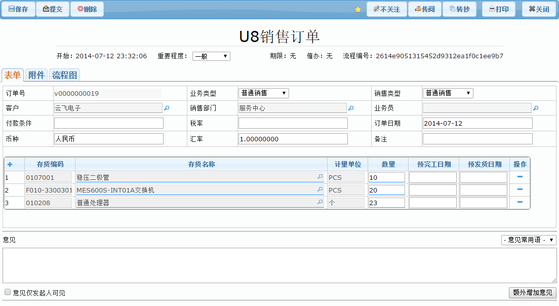 当然,先从用友U8系统建立销售订单,通过预先设置好的事件触发,调用奥科应用平台的流程接口,建立审批流程;审批完成后,将审批结果回写用友U8系统,同样能很好的支持。