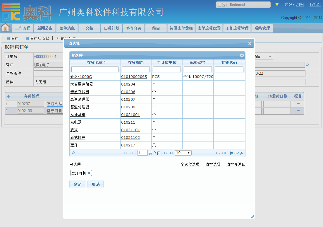 弹出界面,直接将用友U8的实时数据,加载到奥科应用平台的统一界面中,如下图: