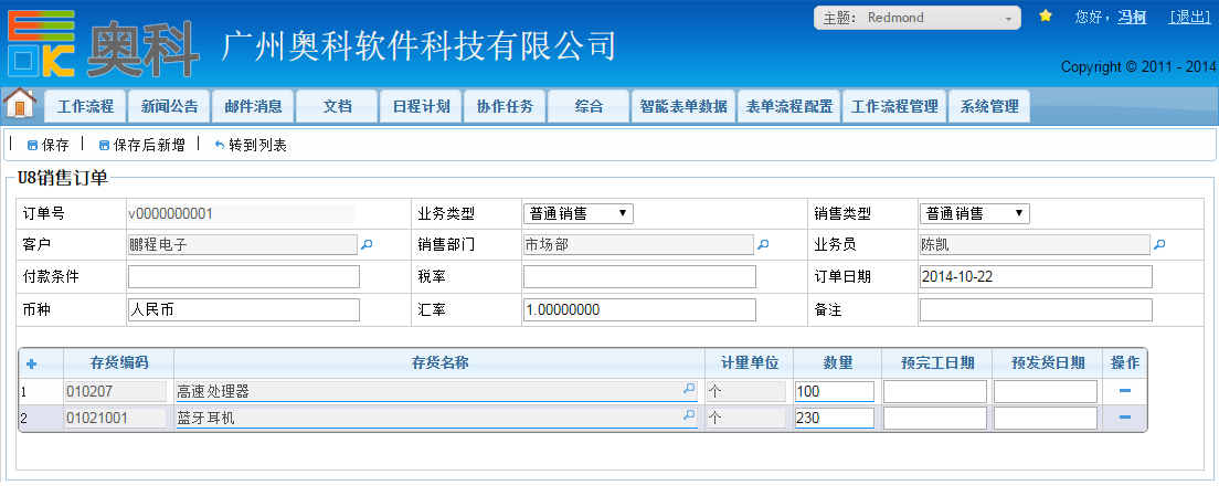 以集成用友U8系统为例,奥科应用平台的自定义销售订单,基础数据包括客户、销售部门、业务员、存货等,都从用友U8系统中读取,效果如下图: